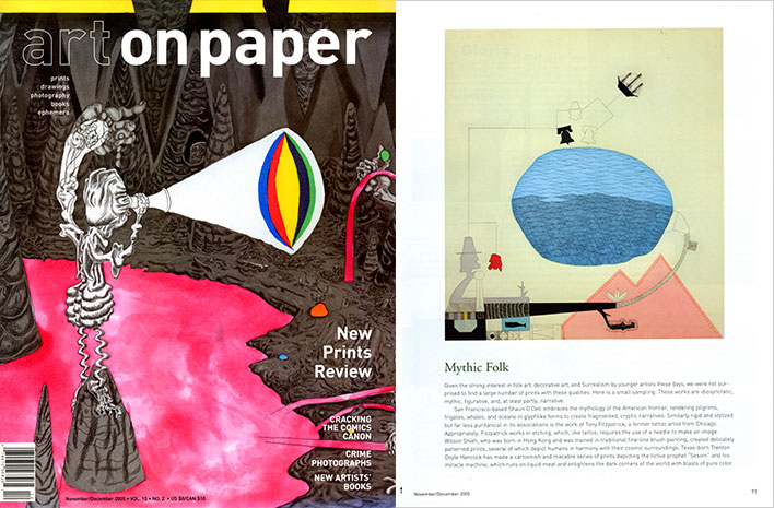 San Francisco-based Shaun O’Dell embraces the mythology of the American frontier, rendering pilgrims, frigates, whales, and oceans in glyphlike forms to create fragmented, cryptic narratives. Similarly rigid and stylized but far less puritanical in its associations is the work of Tony Fitzpatrick, a former tattoo artist from Chicago. Appropriately, Fitzpatrick works in etching, which, like tattoo, requires the use of a needle to make an image. Wilson Shieh, who was born in Hong Kong and was trained in traditional fine-line bruch painting, created delicately patterned prints, several of which depict humans in harmony with their cosmic surroundings. Texas-born Trenton Doyle Hancock has made a cartoonish and macabre series of prints depicting the fictive prophet “Sesom” and his miracle machine, which runs on liquid meat and enlightens the dark corners of the world with blasts of pure color.